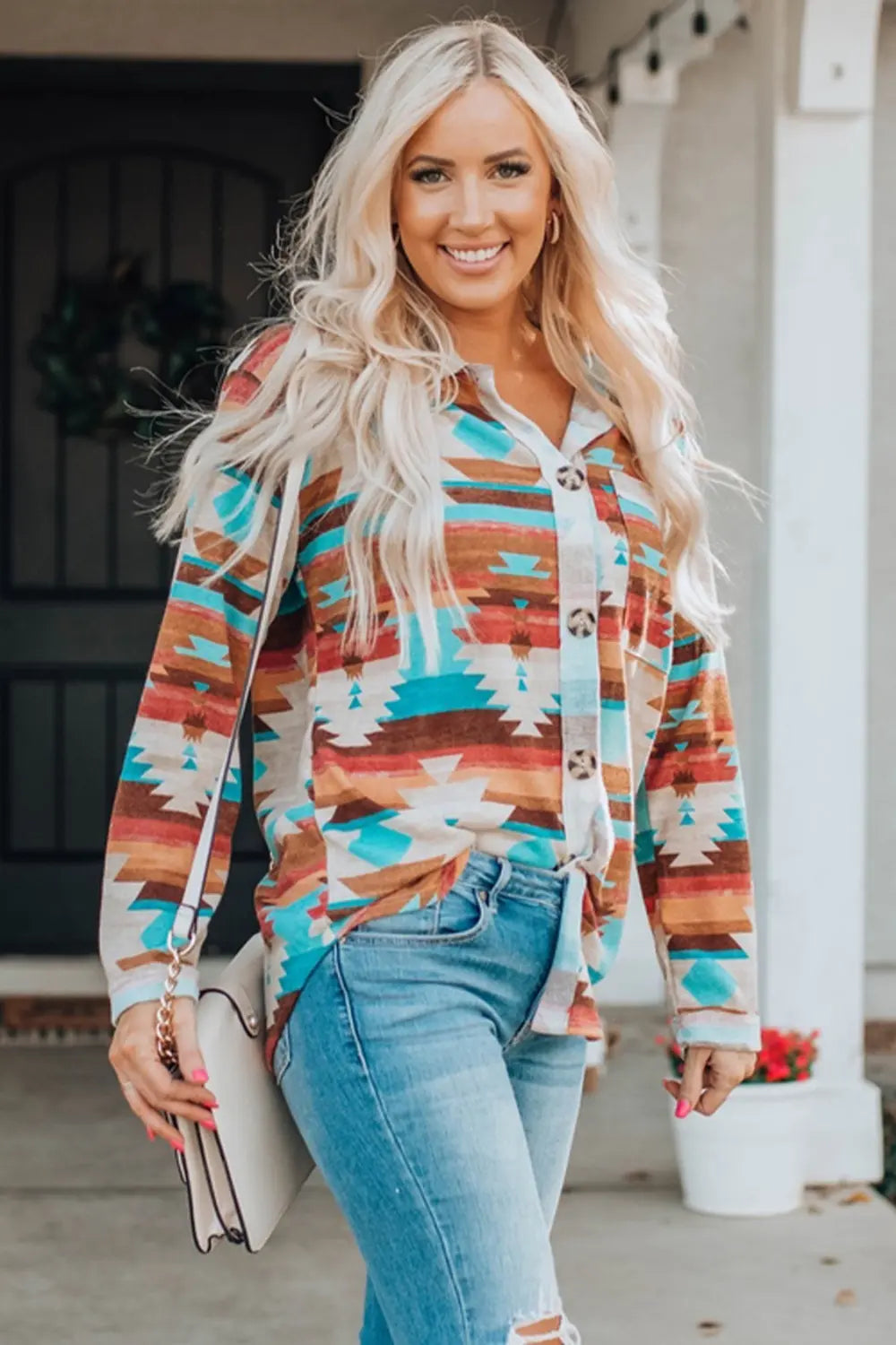 Bold, colorful, and effortlessly stylish—this Aztec button down is made for standout looks. With its eye-catching pattern, lightweight feel, and relaxed fit, it’s perfect for layering over a tank, tucking into denim, or wearing open for a laid-back vibe.